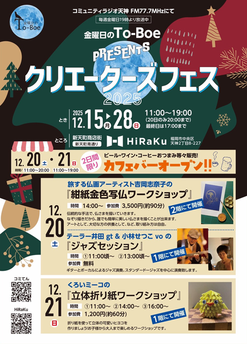 「金曜日のTo-boe」100回を超える放送に出演した数々のゲストと共に、アート作品展示販売や 20、21日の2日間はワークショップ、音楽演奏、パーソナリティ2人によるカフェバーも開催。(展示室入場無料)